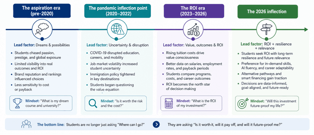 The shift from aspiration-led to ROI-led decision making did not happen overnight. It accelerated through rising tuition costs, tightening immigration policies, and better employment outcome data.