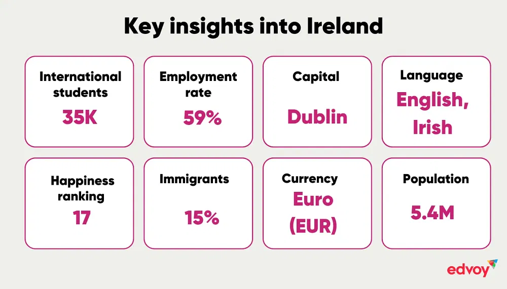 Ireland is a lively and culturally vibrant country featuring scenic landscapes, welcoming people, and high-quality education. With well-ranked universities and research institutes, the country is one of the most preferred study destinations for international students like you. Take a look at a few key insights about Ireland.