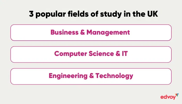 The popular fields of study in the UK include Business & Management, Computer & IT, Engineering & Technology, Law, Media Studies, Hospitality, and Psychology.