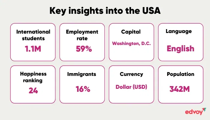 The USA is a popular study destination for international students due to its academic excellence and strong international career prospects. With a prosperous economy and rapidly growing sectors such as healthcare, technology, renewable energy, and education, the USA is an ideal choice for career growth, competitive salaries, and global exposure. You can seek part-time jobs and internships during your studies and gain practical experience that will enhance your employability.